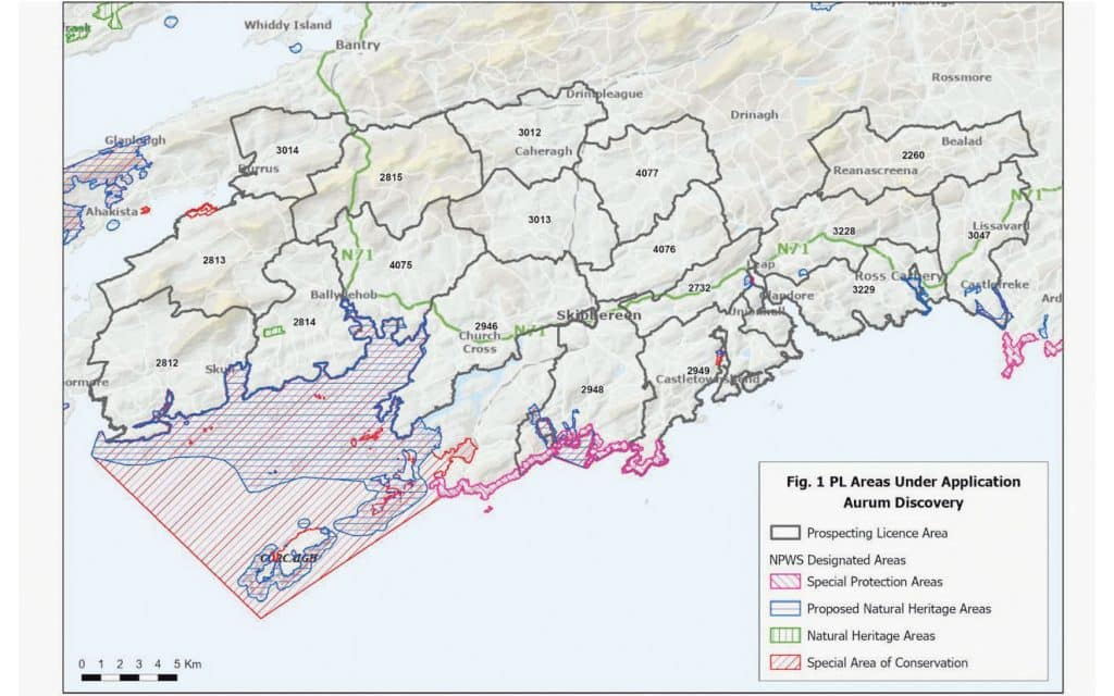 There have been prospecting licences continuously covering these geographical areas for at least the past decade. Prior to Aurum being granted licence on these particular land blocks, they were held by ‘Adventous Exploration Limited’ (AEL), who engaged Aurum to manage exploration projects and provide technical expertise. In fact (AEL) held 100 per cent of the 114,000 hectares West Cork licence block.